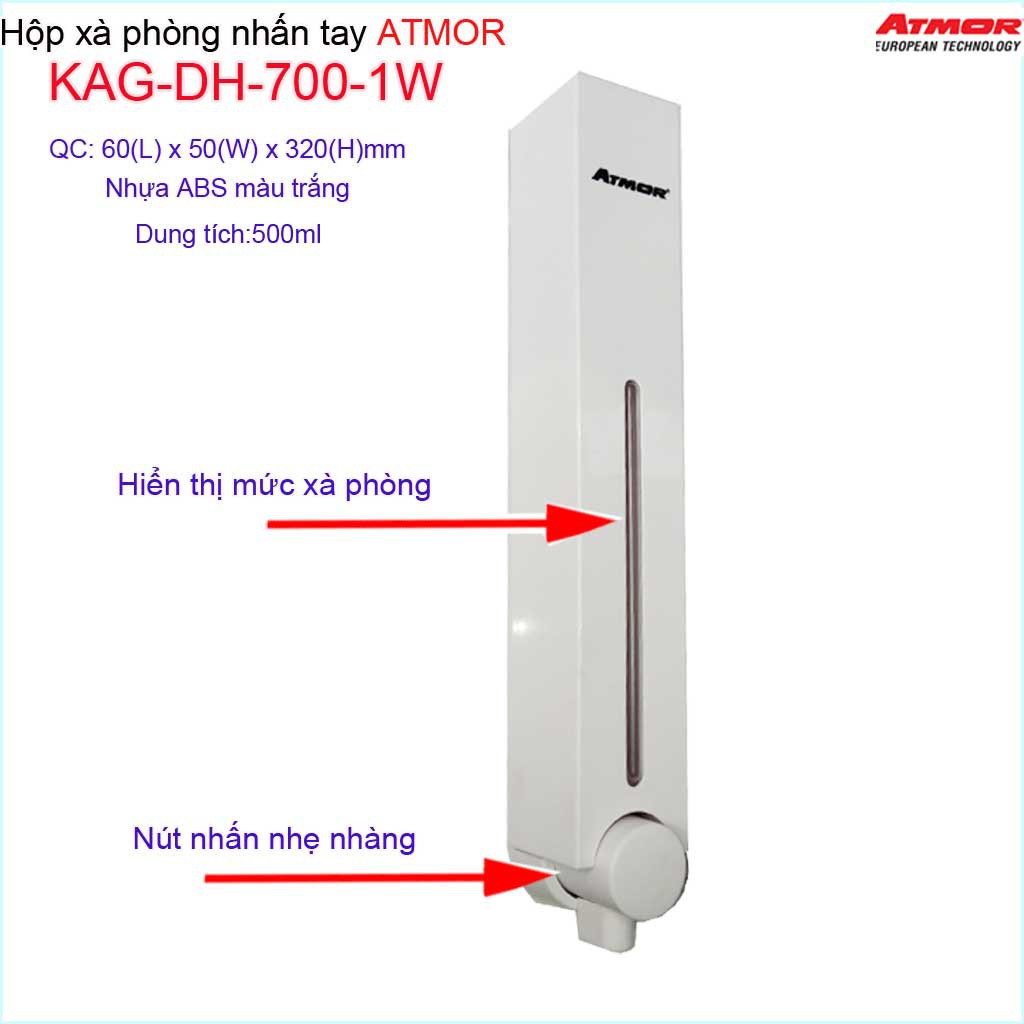 Hộp nhấn xà phòng Atmor KAG-DH7001W-white trắng, bình xịt xà bông 500ml thiết kế sang trọng nhấn êm siêu bềnHộp nhấn xà phòng, Bình xịt xà phòng KAG-DH700.1W ( hay còn gọi là hộp xà phòng nhấn tay, hộp xà phòng treo tường, hộp đựng xà bông nước ...)