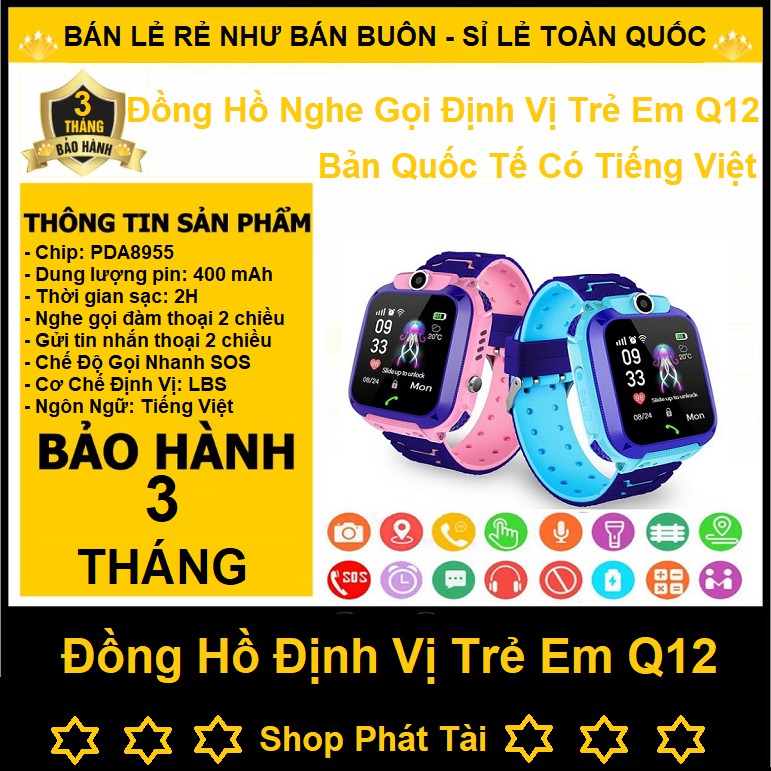 Đồng hộ định vị trẻ em - Đồng hồ định vị GPS - Phần mềm tiếng Việt - Chống nước , chụp hìnhĐồng hồ định vị trẻ em chống nước Q12 có camera là mẫu đồng hồ thông minh định vị LBS dành cho trẻ em có khả năng chống nước đang được ưa chuộng nhất trên thị trường hiện nay, Q12 phù hợp với bé trên 4 tuổi, giúp ba mẹ có thể theo dõi và kết nối với bé, biết bé luôn ở vùng an toàn vào bất cứ lúc nào thông qua ứng dụng Setracker 2 được cài đặt trên điện thoại. Các chức năng chính như định vị LBS nghe gọi như điện thoại, SOS cuộc gọi khẩn cấp, tin nhắn thoại chụp ảnh từ xa gửi vào máy ba mẹ và những tính năng phụ như đếm bước chân, phần thưởng… Đặc tính nổi bật của Q12 sử dụng ngôn ngữ tiếng việt và khả năng chống nước hoàn toàn để bé luôn có thể mang trên tay khi tham gia mọi hoạt động sinh hoạt và vui chơi, cũng như màn hình cảm ứng trực quan giúp bé sử dụng rất nhanh.