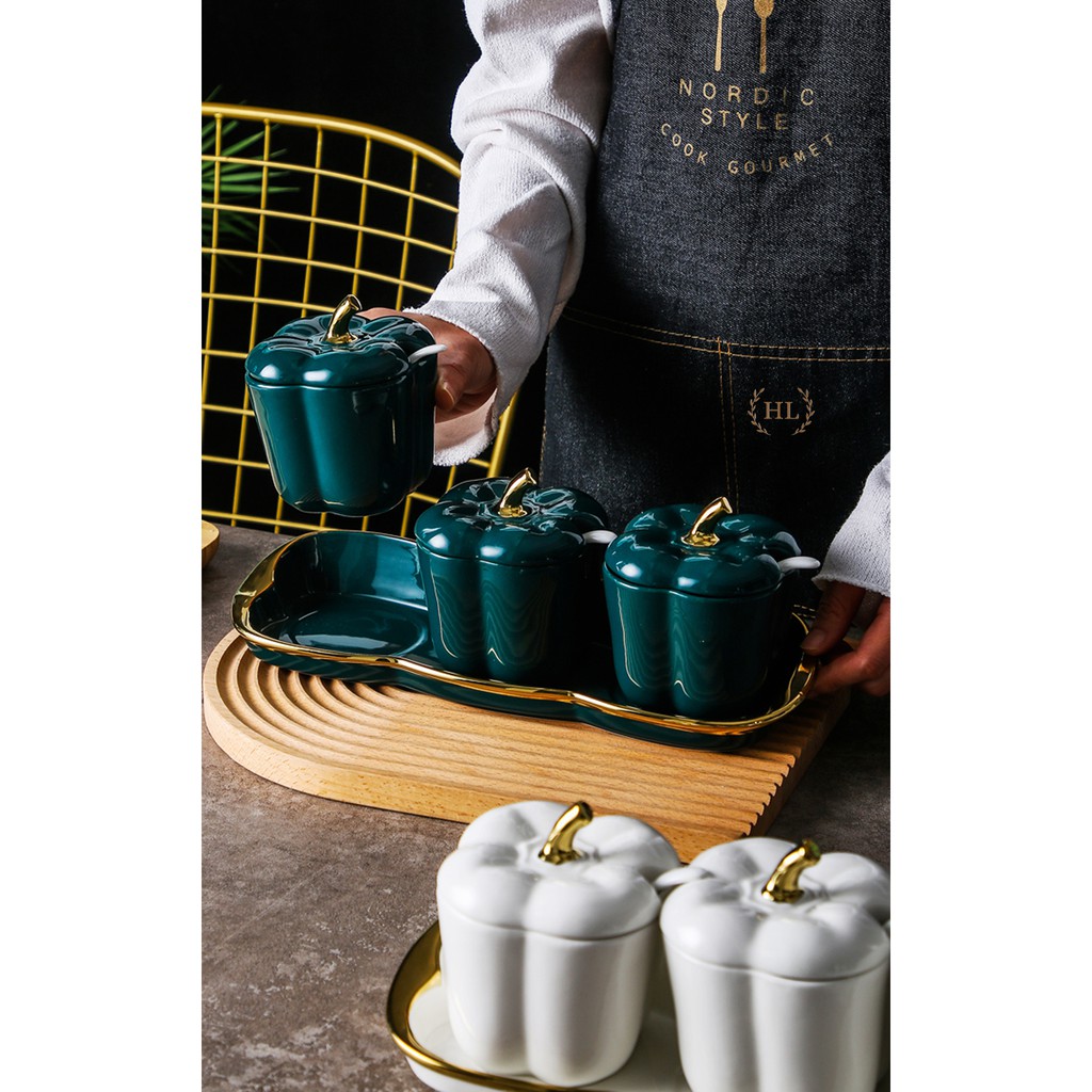 Giới thiệu HŨ ĐỰNG GIA VỊ BẰNG SỨ KIỂU DÁNG ỚT CHUÔNG PHONG CÁCH VINTAGE | BỘ GIA VỊ SỨ 3 KÈM ĐẾ SỨ CAO CẤP KẺ CHỈ VÀNG KIM DECOR