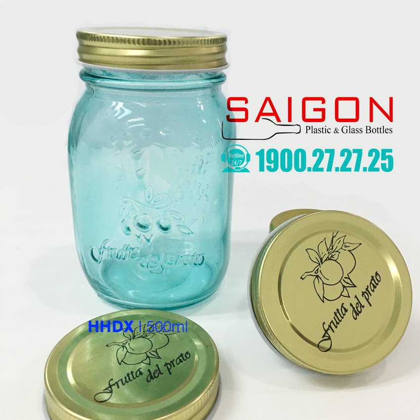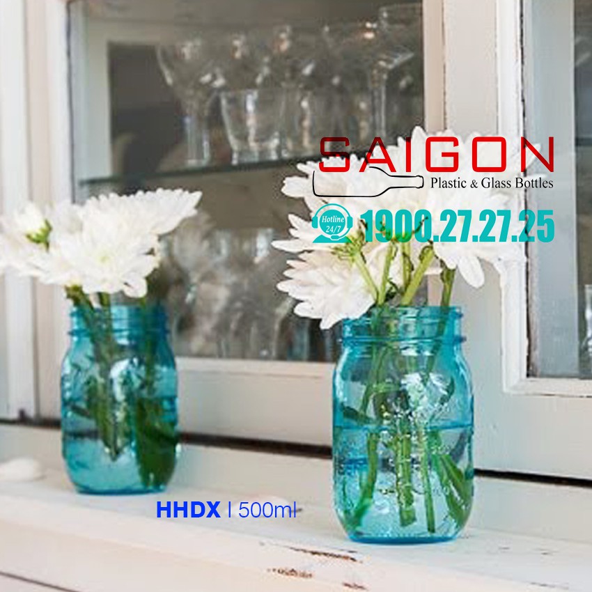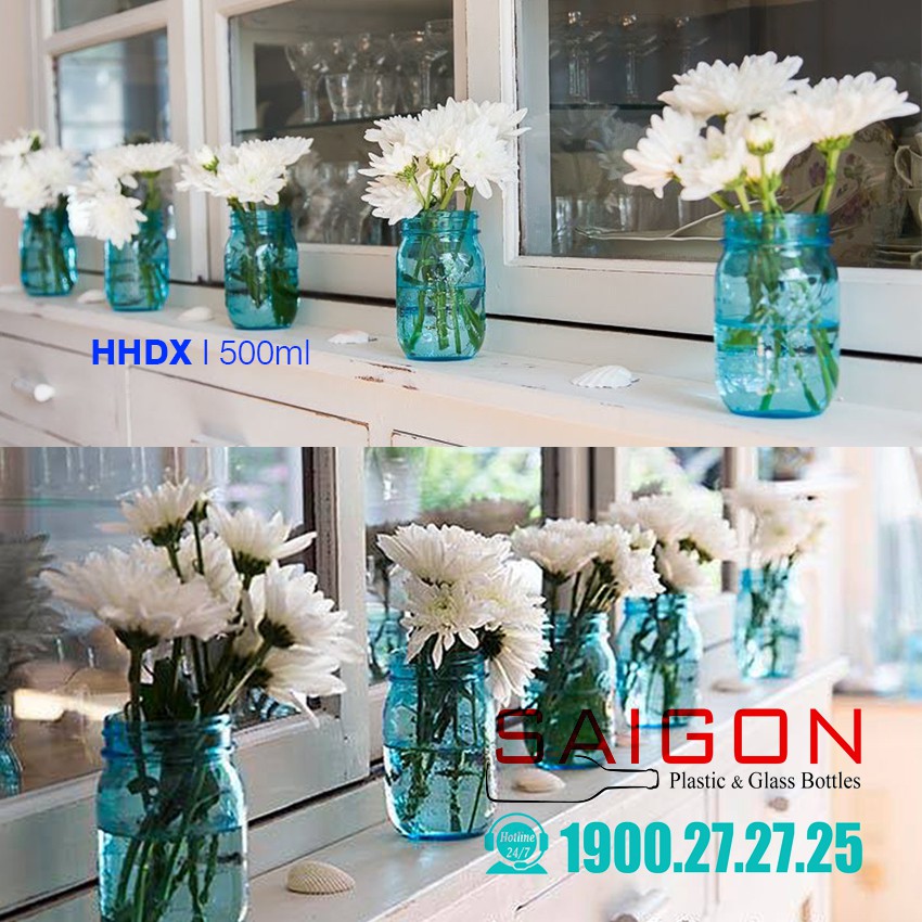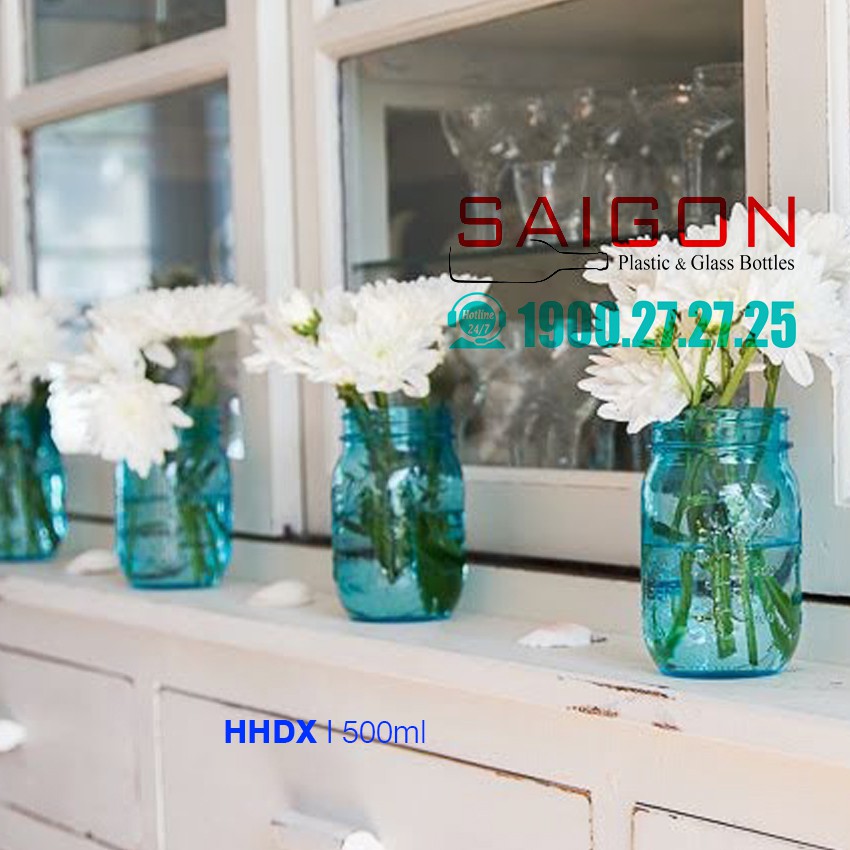Hũ Thủy tinh Mason 500ml màu Xanh Dùng Cắm hoa trang trí bàn tiệc