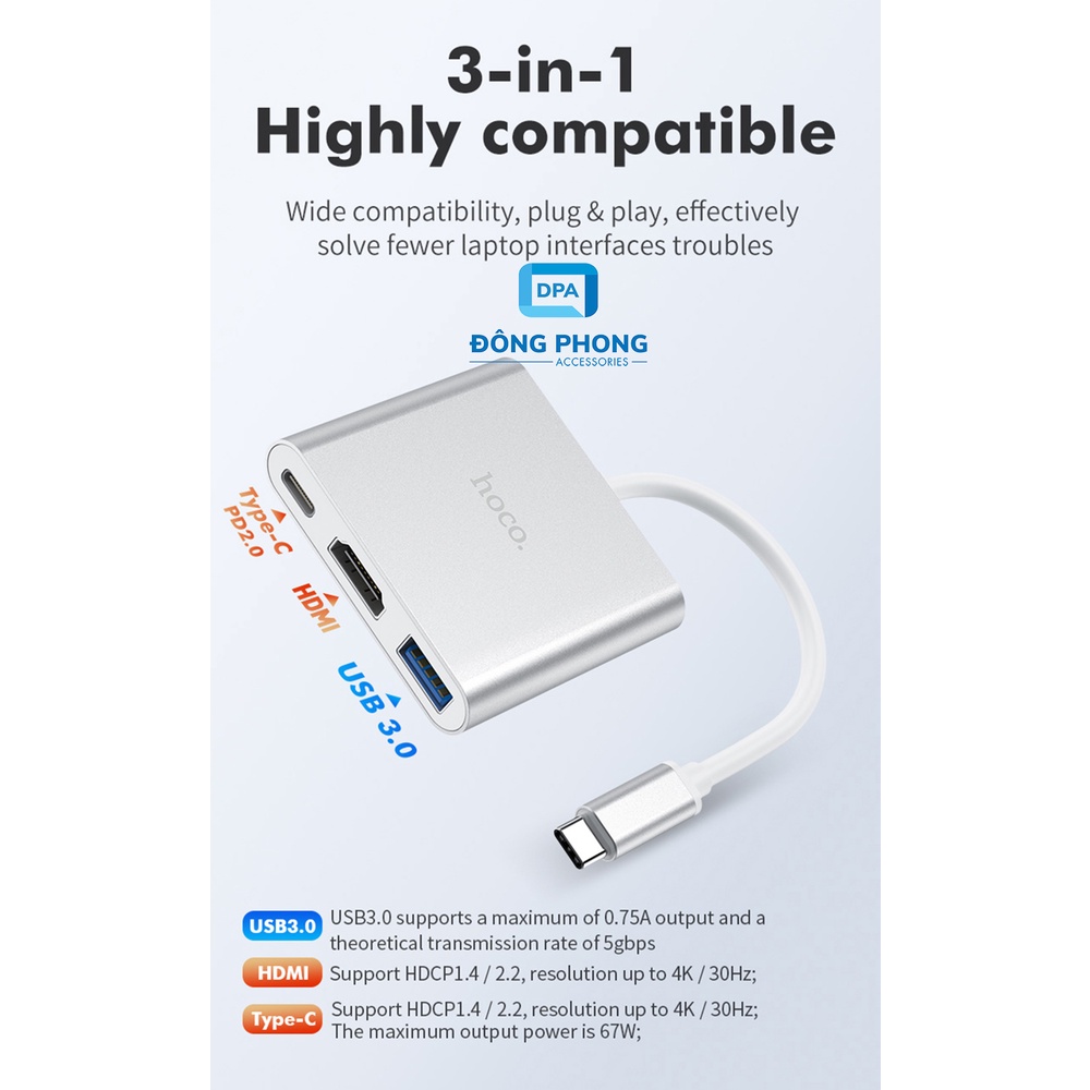 - Hub Chuyển Type C Ra USB 3.0 , HDMI & PD 2.0 Hoco HB14 ra đời như một giải pháp tối ưu, hỗ trợ mọi người dùng sở hữu những chiếc smartphone cao cấp hay laptop thế hệ mới, có thể làm việc và kết nối với các thiết bị ngoại vi dễ dàng hơn từ cổng Type C. Việc trang bị bộ adapter này sẽ giúp bạn mở rộng đến 3 cổng kết nối khác nhau, đáp ứng mọi nhu cầu sử dụng từ công việc cho đến giải trí.