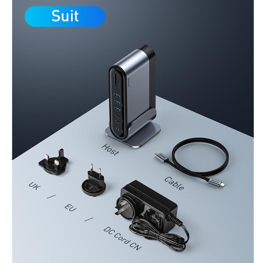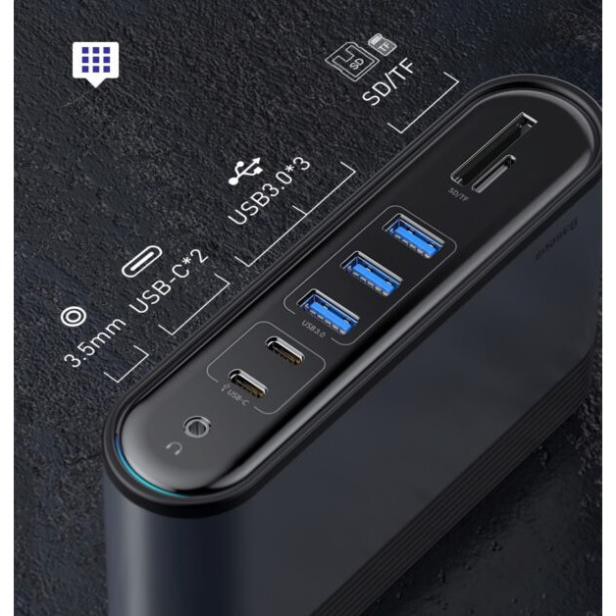 🏎Hub chuyển đa năng Baseus Working Station 17 in 1 Multifunctional được trang bị gần như tất cả các cổng chuyển đổi cơ bản và hỗ trợ hầu hết các thiết bị số hiện nay từ Macbook, Smartphone / Tablet / Laptop Android / Windows... 🏎Bội HUB chuyển đổi có ngõ vào là cổng USB Type C và ngõ ra là hầu hết các chuẩn giao tiếp phổ thông hiện nay như: USB 2.0 / USB 3.0 / HDMI*3 / USB 3.0 / Card Reader / RJ-45 / AUX 3.5mm...