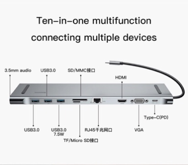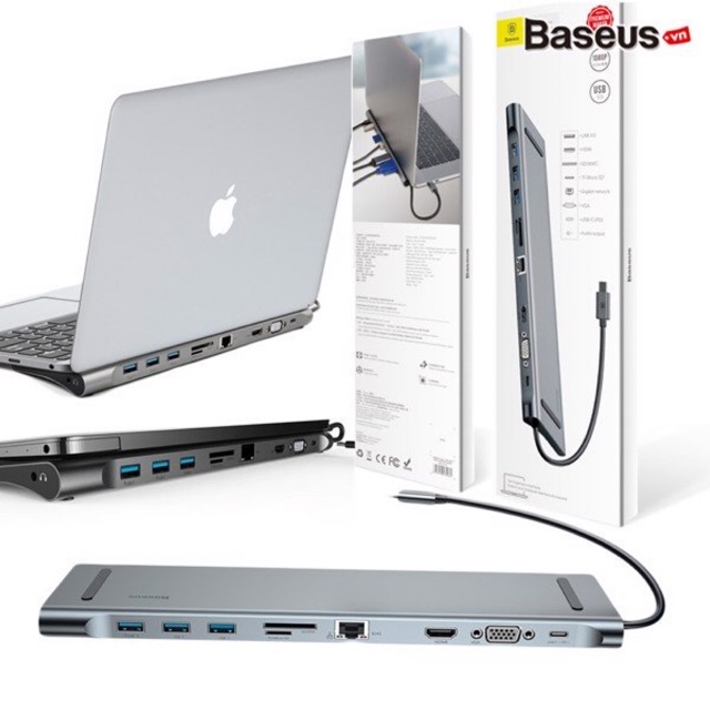Bộ Hub chuyển đa năng Baseus Enjoyment Series Type C chuyển đổi các cổng Thunderbolt trên Macbook pro 2016/ 2017/2018 hay trên cổng USB TYPE C trên các smatphone/tablet/laptop androi/ưindows.Bộ hub chuyển có ngỏ vào là cổng USB TYPE -C và ngỏ ra là hàu hết các chuản giao tiếp phổ thông hiện nay như USB2.0/3.0/hdmi/vga/usb3.0/card reader/rj-45/aux 3.5....