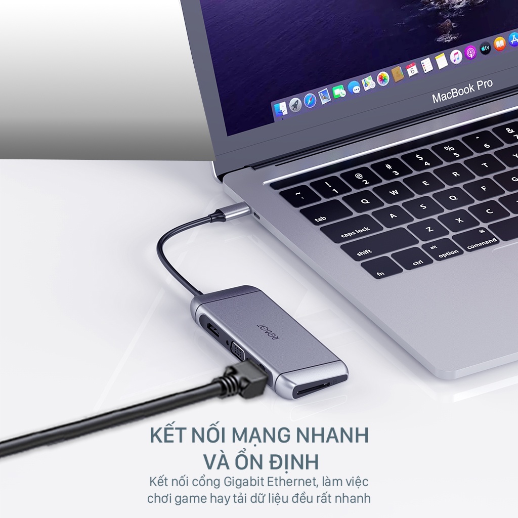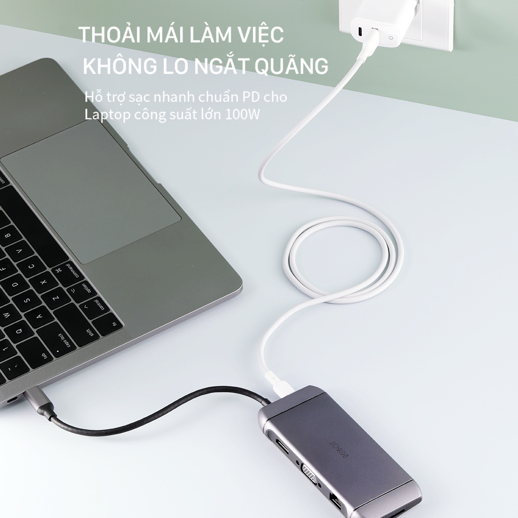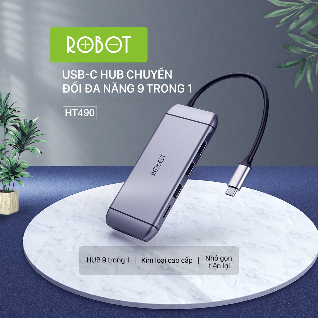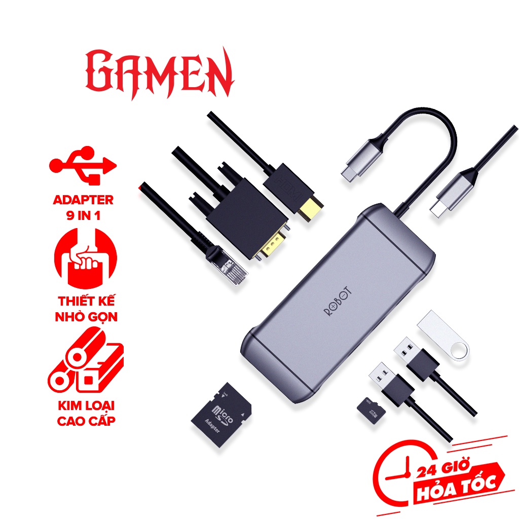HUB CHUYỂN ĐỔI 9 TRONG 1 ROBOT HT490 TỪ CỔNG TYPE-C SANG CỔNG USB 3.0/ USB 2.0/ Type-C/ HDMI/ SD/ MicroSD/ VGA/ LANs - HỖ TRỢ CHẤT LƯỢNG HÌNH ẢNH ULTRA HD 4K VÀ SẠC NHANH CHUẨN PDSản phẩm chính hãng ROBOT