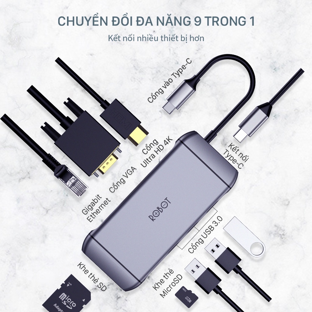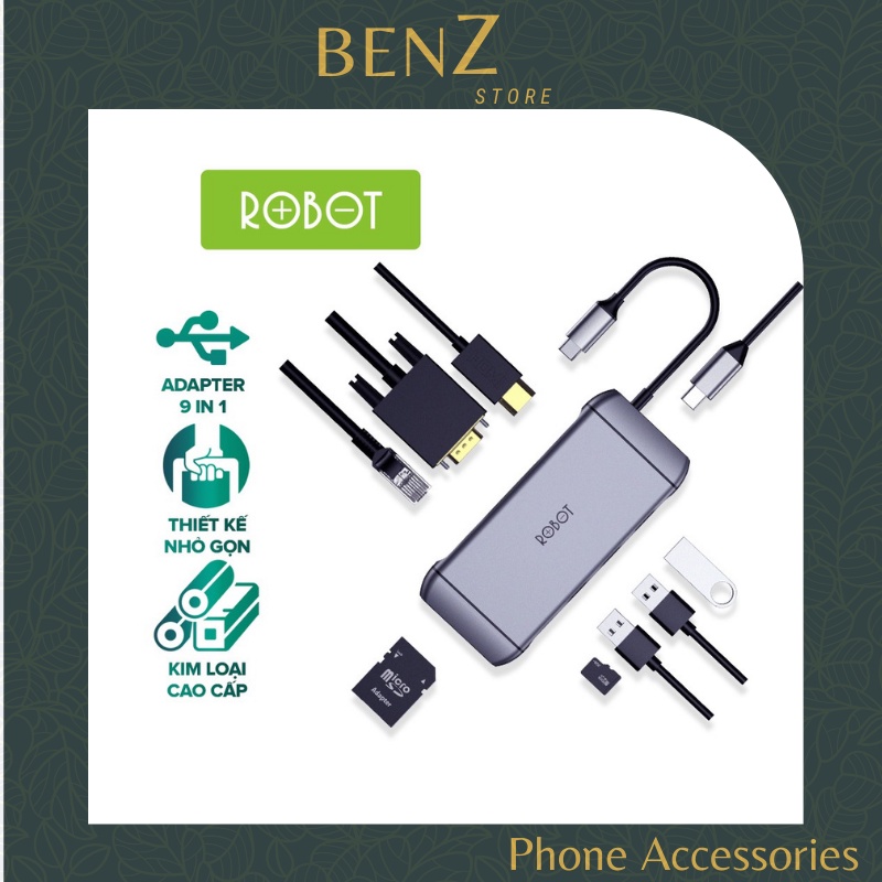 HUB Chuyển Đổi 9in1 ROBOT HT490 Type-C to USB 3.0/2.0/ HDMI/PD/SD/TF/PD/VGA/UltraHD BenZ Store