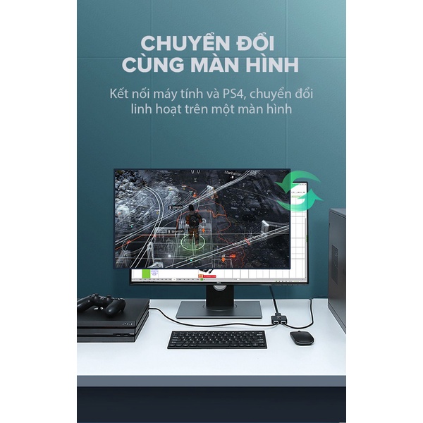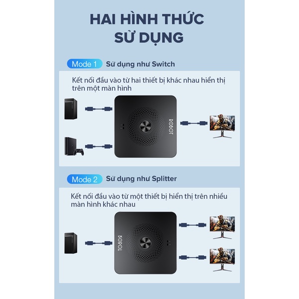 - HUB ROBOT HM103 giúp kết nối máy tính và PS4, kết nối thiết bị chơi game/ đầu thu TV, có thể chuyển đổi linh hoạt trên cùng 1 màn hình thông qua 1 nút chuyển đổi.