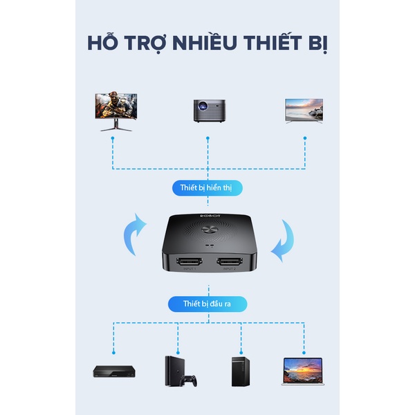 - Bộ chuyển đổi HDMI hai chiều có thể dùng để kết nối nhiều thiết bị với nhau, có thể chuyển đổi linh hoạt giữa các thiết bị HDMI chỉ với một nút bấm, giải pháp phù hợp khi số cổng HDMI của màn hình hiển thị không đủ đáp ứng.