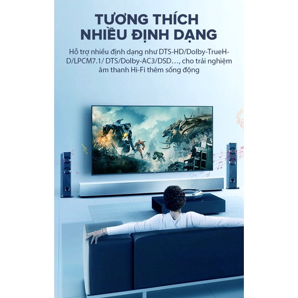- HUB ROBOT HM103 hỗ trợ nhiều định dạng như DTS-HD/ Dolly-TrueH-D/ LPCM7.1/ DTS/ Dolly-AC3/ DSD..., cho trải nghiệm âm thanh Hi-Fi thêm sống động, hỗ trợ định dạng 4K*2K@60 Hz kết hợp hiệu ứng 3D, mang đến trải nghiệm hình ảnh và âm thanh được đồng bộ sắc nét và chân thực.