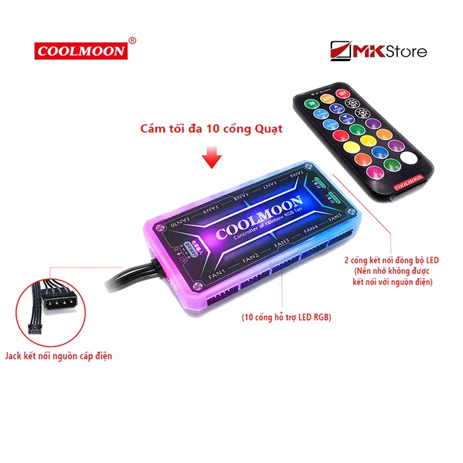 - Khả năng điều khiển cùng lúc đến 10 quạt Coolmoon / Coolman và 2 Dây LED