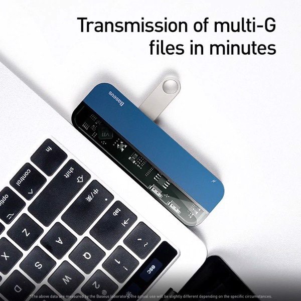 - Hỗ trợ truyền tải data tốc độ cao với tốc độ có thể lên đến 5Gbps qua cổng USB 3.0 . Bộ Hub đa năng Baseus Transparent Series 5 in 1 Multifunctional HUB giúp bạn có thể dễ dàng kết nối smartphone/ Tablet/ Macbook (type C) với các thiết bị ngoại vi như máy in, bàn phím, chuột,... Việc đồng bộ, chia sẽ dữ liệu/ hình ảnh/ video độ net cao với các ỗ lưu trữ ngoài trở nên dễ dàng hơn bao giờ hết .
