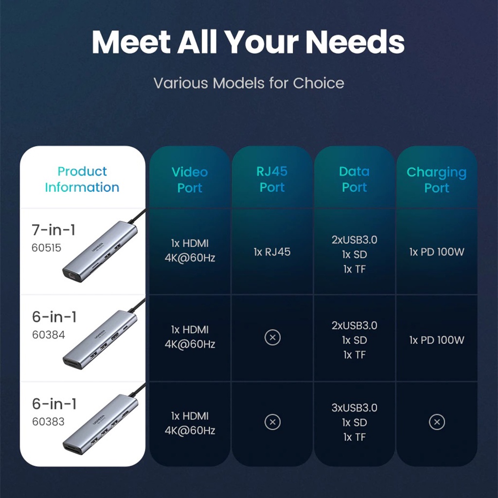 - Hỗ trợ (Max): HDMI (4K@60Hz), USB (5Gbps), RJ45 (1Gbps), PD (100W), SD/TF (104Mbps)