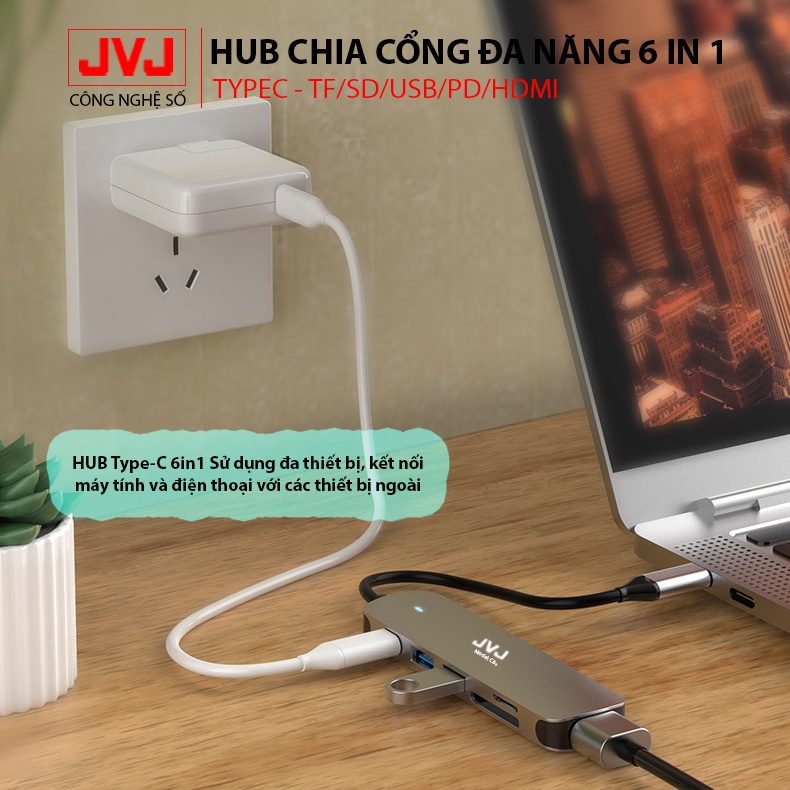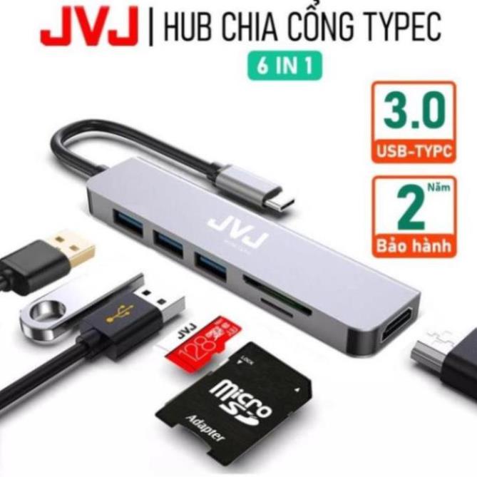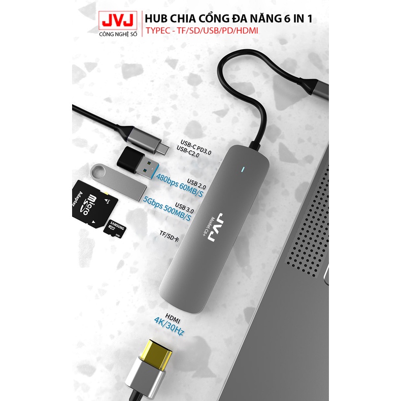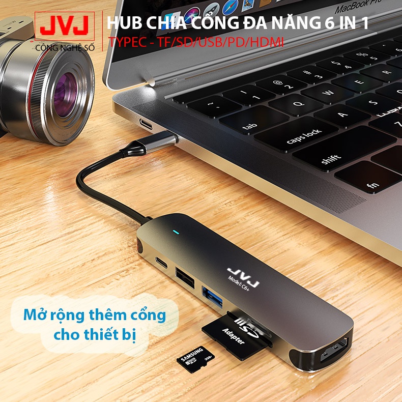 Hub type C USB C6 JVJ 6 trong 1 đa năng cổng chuyển đổi chia cổng USB 3.0 tốc độ 500Mb/s SD, TF, 4K,HDMI cho MacBook lap