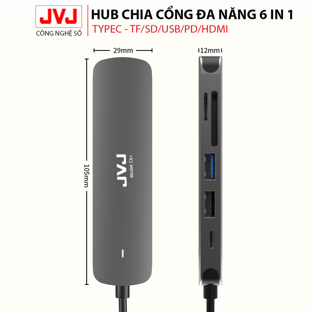 Giới thiệu Hub type C USB C6 JVJ 6 trong 1 đa năng cổng chuyển đổi chia cổng USB 3.0 tốc độ 500Mb/s SD, TF, 4K,HDMI cho MacBook lap