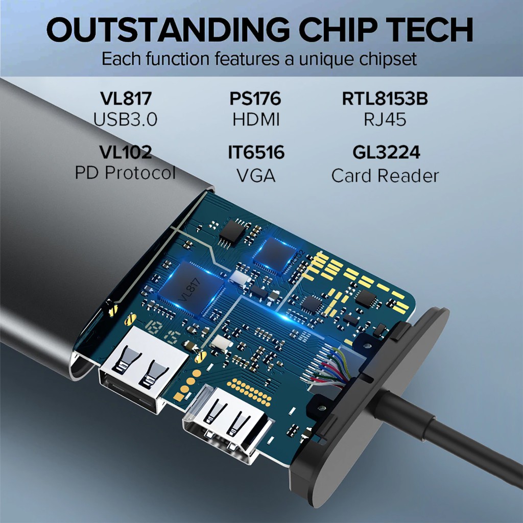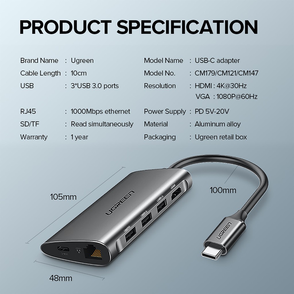 UGREEN CM147 là bộ chuyển đổi tín hiệu từ 1 cổng Type-C ra các cổng VGA + RJ45 + Hub USB 3.0 + TF/SD Card + cổng sạc Type-C, là giải pháp hoàn hảo giúp các thiết bị chỉ hỗ trợ 1 cổng USB Type C có thể phục vụ cùng lúc nhiều nhu cầu giải trí, công việc khác nhau một cách tiện lợi hơn, với chất lượng cao cấp đảm bảo mọi tín hiệu luôn ổn định ở mức tối đa.Thông số kỹ thuật