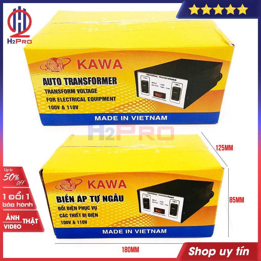 Biến áp tự ngẫu Kawa có 2 loại với chức năng chuyển điện 220v sang 110V-100V và đổi điện từ 110V sang 220V. Bộ đổi nguồn đang được Thế giới công nghệ H2Pro phân phối và bán lẻ, giao hàng toàn quốc là hàng chính hãng, được sản xuất tại Việt Nam. H2Pro có đủ công suất đổi nguồn cho khách hàng lựa chọn như 250W, 500W, 750W, 1200W, 1500W, 2000W, 3000W.- Lưu ý: Chọn công suất đổi nguồn phù hợp với thiết bị
