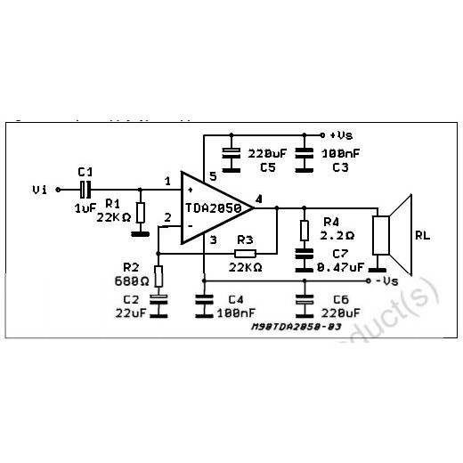 IC khuếch đại công suất TDA2050A chạy ở chế độ AB cho công suất tối đa 35W với loa 4 ôm.