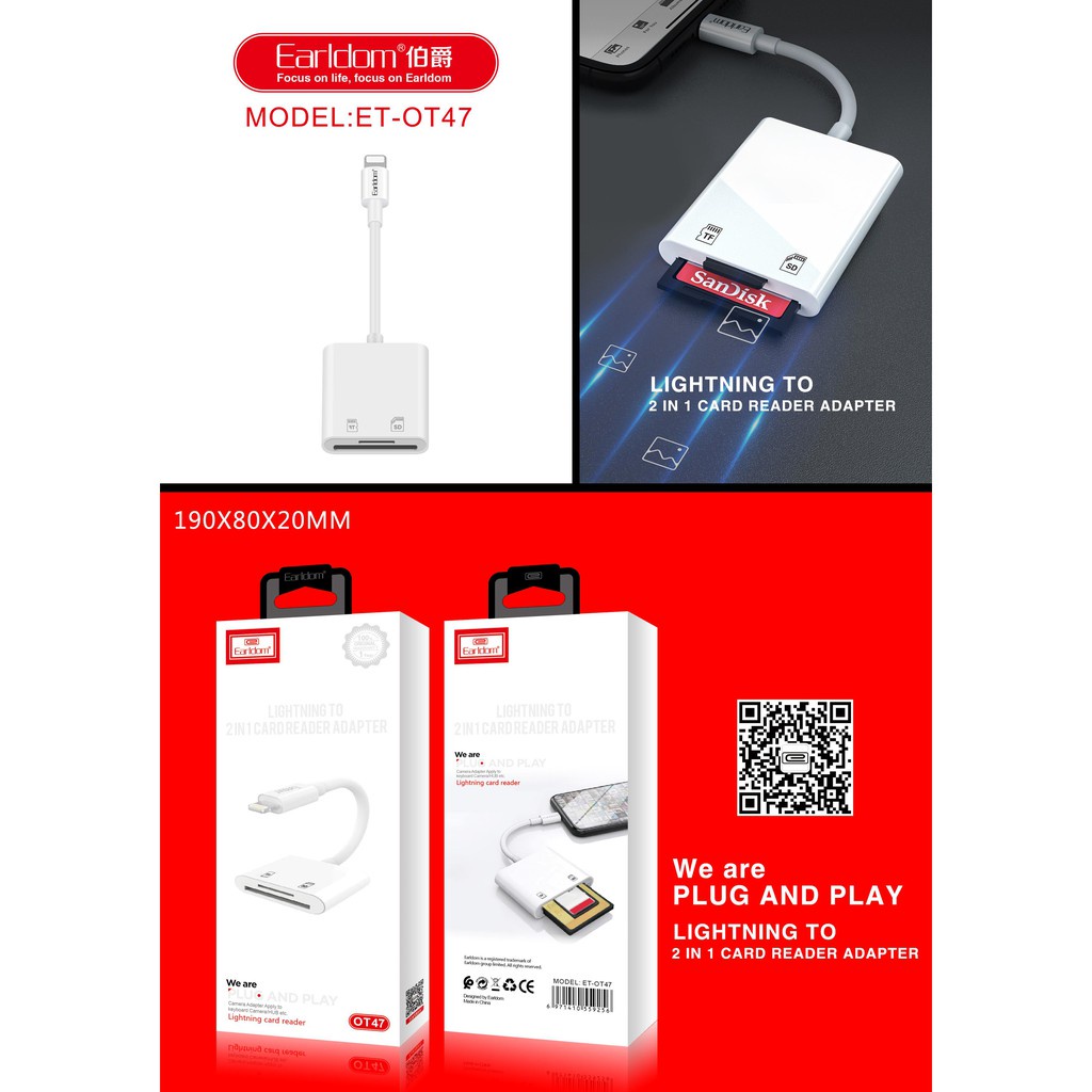 - Nếu bạn cảm thấy khó khăn khi cần tải ảnh, video từ thẻ nhớ SD hoặc TF lên iPad và iPhone thì sản phẩm Jack Chuyển Đổi Từ Lightning Sang Đầu Đọc Thẻ Nhớ SD Hoặc TF Earldom ET-OT47 là sản phẩm dành cho bạn