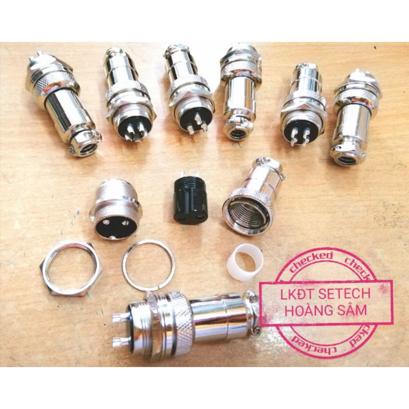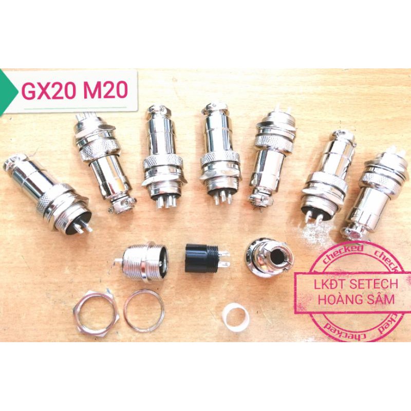 Jack nối hàng không GX20 M20 cao cấp 1 cặp đực cái.* Đầu đực hàn dây, mặt có lỗ cắm từ 2P - 5P, có vỏ Kim loại nhẵn bóng, đuôi có đai gông vặn ốc giữ dây. Trong có ống nhựa cách ly lõi hàn dây với vỏ.
