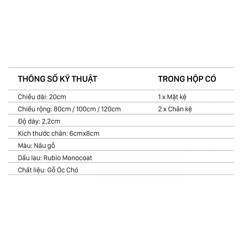 Bộ sản phẩm hoàn chỉnh bao gồm một mặt kệ và hai chân kệ được sản xuất hoàn toàn từ chỗ óc chó (Walnut) nhập khẩu. Với đặc tính nổi bật như: độ cứng và độ bền cao, khả năng kháng sâu tự nhiên, gỗ óc chó không bị mối mọt hay ẩm mốc và không bị cong vênh kể cả trong điều kiện thời tiết ở Việt Nam.