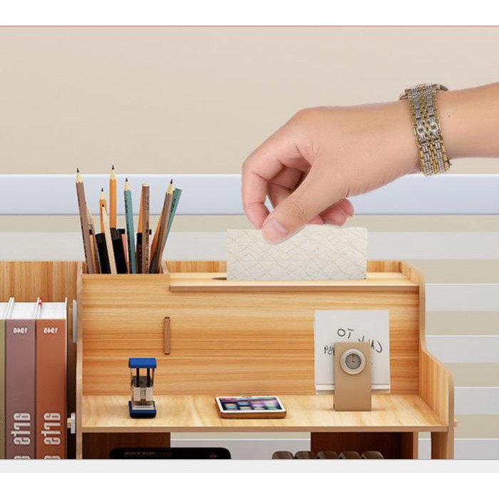 Ngoài ra có một chi tiết nhỏ rất khác so với các loại kệ mini khác đang có trên thị trường, đó là Kệ Pro-Shelf được tích hợp thêm một ngăn chứa khăn giấy lau. Chính điều này cũng đã giúp bạn "tiết kiệm" được tối đa mặt bàn làm việc của bạn khi không cần phải mua thêm hộp để đựng khăn giấy.
