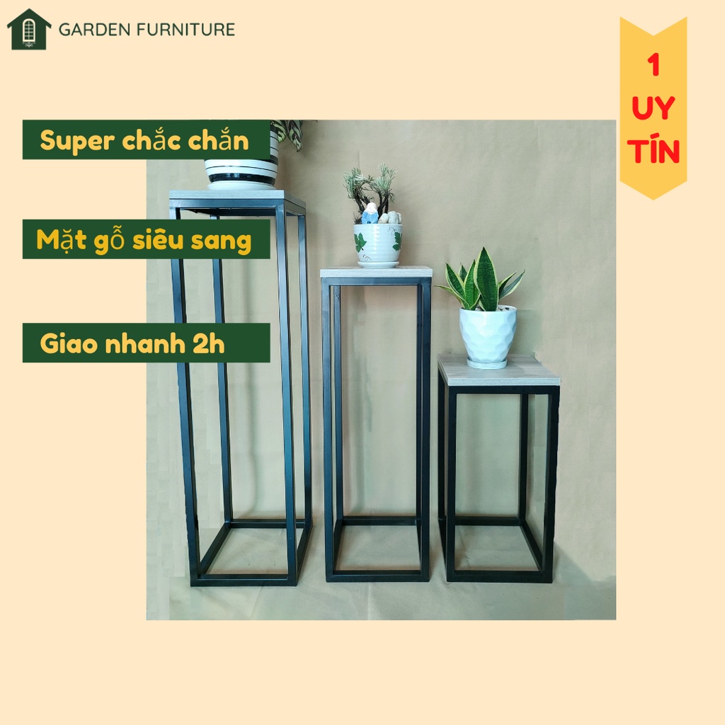 - KỆ SẮT TRƯNG CÂY CẢNH được xử lí mối hàn đẹp, kĩ, xử lí sơn tĩnh điện nên tiện dụng kê chậu hoa cả trong nhà và ngoài trời, tránh rỉ sét, mặt gỗ sang trọng, hiện đại