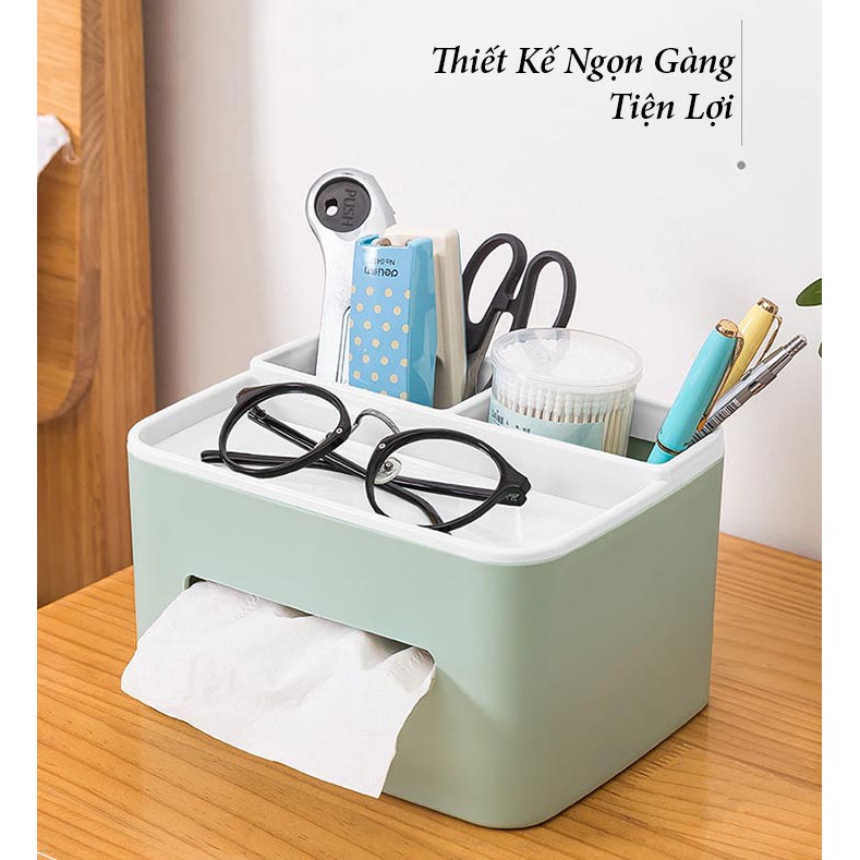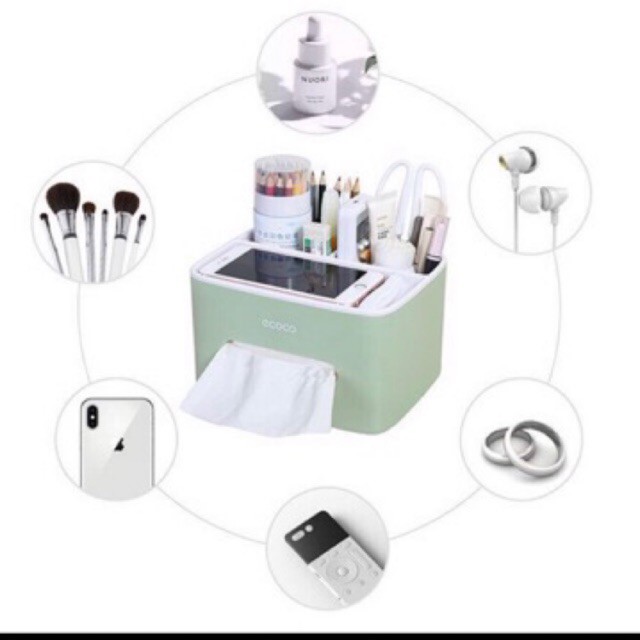Sản phẩm thiết kế khá thông minh, bao gồm một chiếc hộp để giấy đứng tiện dụng, chỉ cần mở hộp cho giấy vào; mỗi lần sử dụng thì dễ dàng lấy giấy chỉ với một tay.Phía trên là nắp hộp giấy màu trắng có thể để vài vật linh tinh trang trí hoặc vài hủ kem, đồ trang sức. Hộp đựng giấy ăn đa năng Ecoco còn kèm khay để điều khiển, điện thoại hoặc kéo, lược vô cùng tiện dụng giúp căn phòng của bạn luôn ngăn nắp, gọn gàng, sạch sẽ.Thêm 1 ngăn nhỏ đựng các đồ đạc xinh xinh.