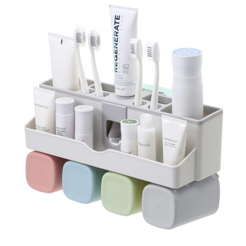 Kệ để đồ nhà tắm, treo bàn chải đánh răng, nhả kem tự động, tặng kèm 2/3/4 cốc, không cần khoan tường