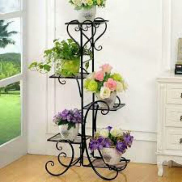 Kệ để chậu hoa 5 tầng được bằng sắt vững chắc, giá đỡ chậu hoa này sẽ làm nổi bật thêm vẻ đẹp của chậu hoa, làm điểm nhấn thu hút cho không gian nhà bạn.Diện tích khiêm tốn nơi ban công hay trong nhà bạn sẽ trở thành khu vườn thu nhỏ thật yên bình với những chậu cây mà bạn yêu thích. Ngôi nhà sẽ trở thành tác phẩm nghệ thuật mới lạ và sinh động hơn khi những chậu cây xinh xinh được đặt trên 1 chiếc giá đỡ bằng sắt nghệ thuật.