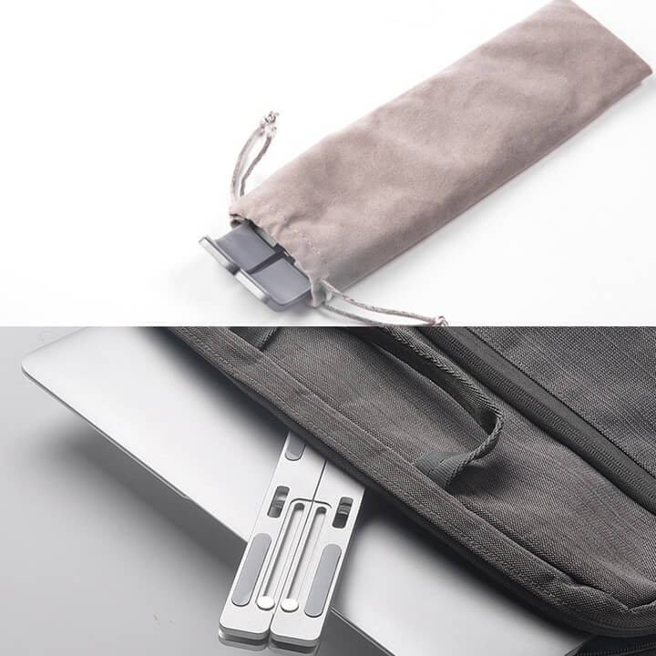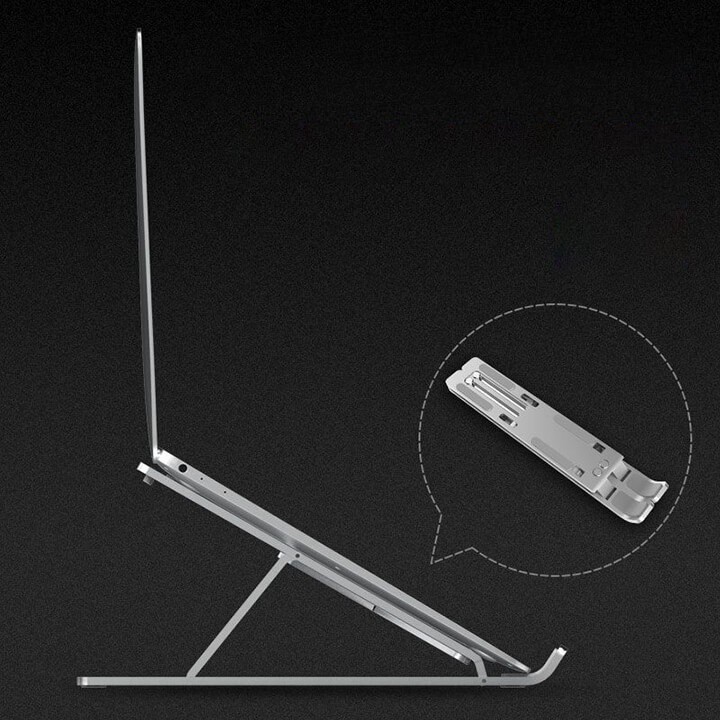 Giá đỡ Macbook cho phép tùy chỉnh góc đứng với nhiều chế độ cao hoặc thấp, Phần tiếp xúc kệ đỡ laptop có đệm cao su tăng độ bám và tránh gây trầy xước cho máy. Phần dưới của kệ đỡ Macbook và máy tính có gờ cao su chặn giữ cố định máy trên kệ.