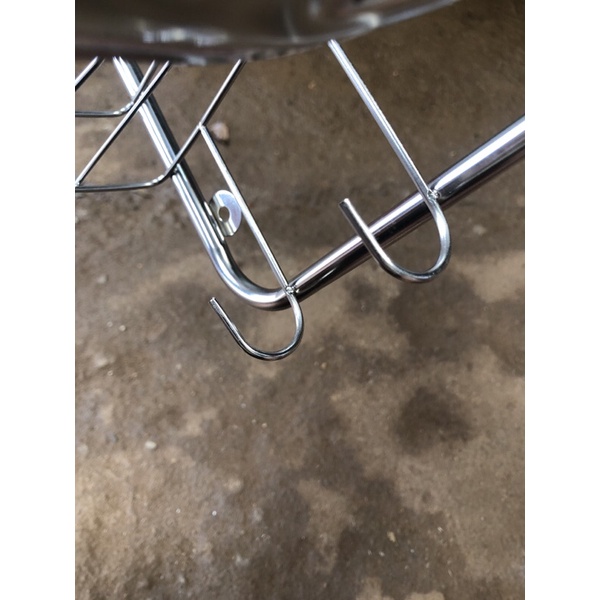 Với hai tầng kệ đựng được nhiều chai dầu gội xà bong, có hai thanh móc máng đồ.