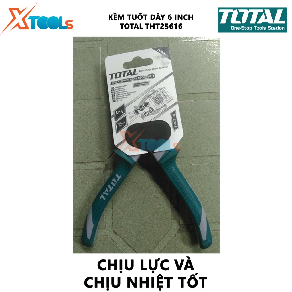 - Kềm tuốt dây điện 6in Total THT25616 là dụng cụ chuyên dụng cho việc tuốt dây điện mà không tác động quá nhiều hay làm hư hỏng phần lõi bên trong, có thể cắt, tuốt từ 10 – 20 loại dây. Nếu bạn làm công việc như lắp đặt, sửa chữa trong ngành điện, bảo dưỡng, bảo trì các thiết bị điện gia dụng, ô tô,…thì đây là sản phẩm hỗ trợ đắc lực, hiệu quả - không nên bỏ qua.
