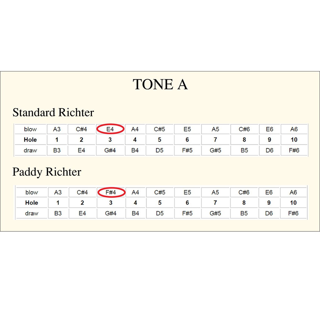 Ví dụ: Diatonic tone C bản paddy richter sẽ có sẵn note La thấp ở lỗ +3 mà không cần độ kèn.