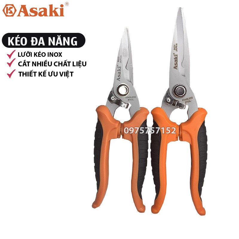 Kéo đa năng hãng Asaki là dụng cụ cắt được vật dày mà kéo văn phòng thông thường không thể cắt được hoặc nếu cắt được thì cũng làm kéo nhanh hỏng. Kéo còn được dùng cắt tỉa cây như kéo cắt tỉa bonsai, kéo cắt được vỏ lon nước ngọt lon bia hay cắt được kim loại có tính chất tương tự. Kéo đa năng cắt được nhựa tấm mica hay dây nhựa gàn thùng hàng.Kéo đa năng Asaki còn có lõm tuốt vỏ dây điện, là sản phẩm các kỹ thuật viên cần có một cây để sẵn trong túi khi làm việc.