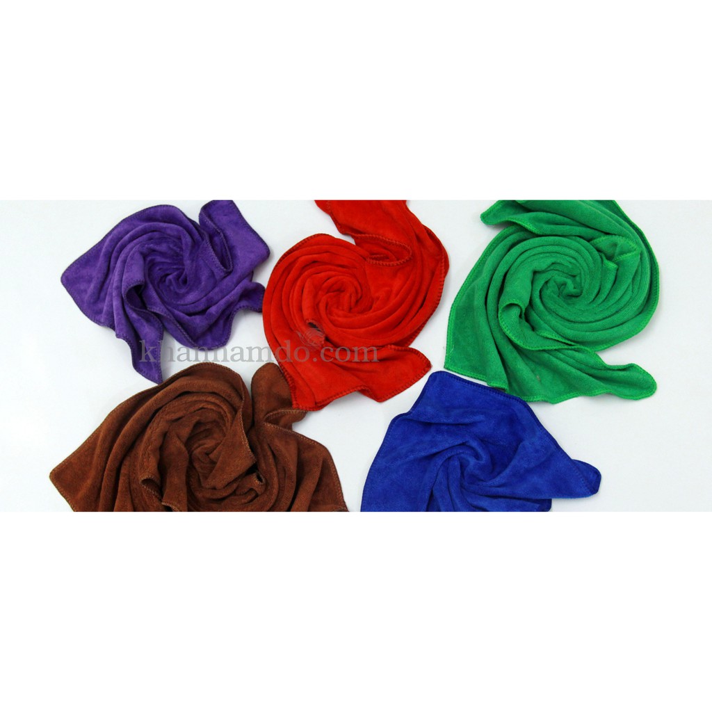 Khăn đa năng: Có cấu trúc bằng các sợi microfiber (sợi vi tổng hợp từ Polyester và Polyamide). Sợi này có kích thước chỉ bằng 1/100 sợi tóc, do đó khăn có rất nhiều những lỗ nhỏ, nhờ đó mà khăn có tính thấm hút nước đặc biệt hơn so với các loại khăn khác. Không chỉ vậy khăn có thể khô nhanh, bạn chỉ cần phơi trong bóng râm.Ưu điểm: