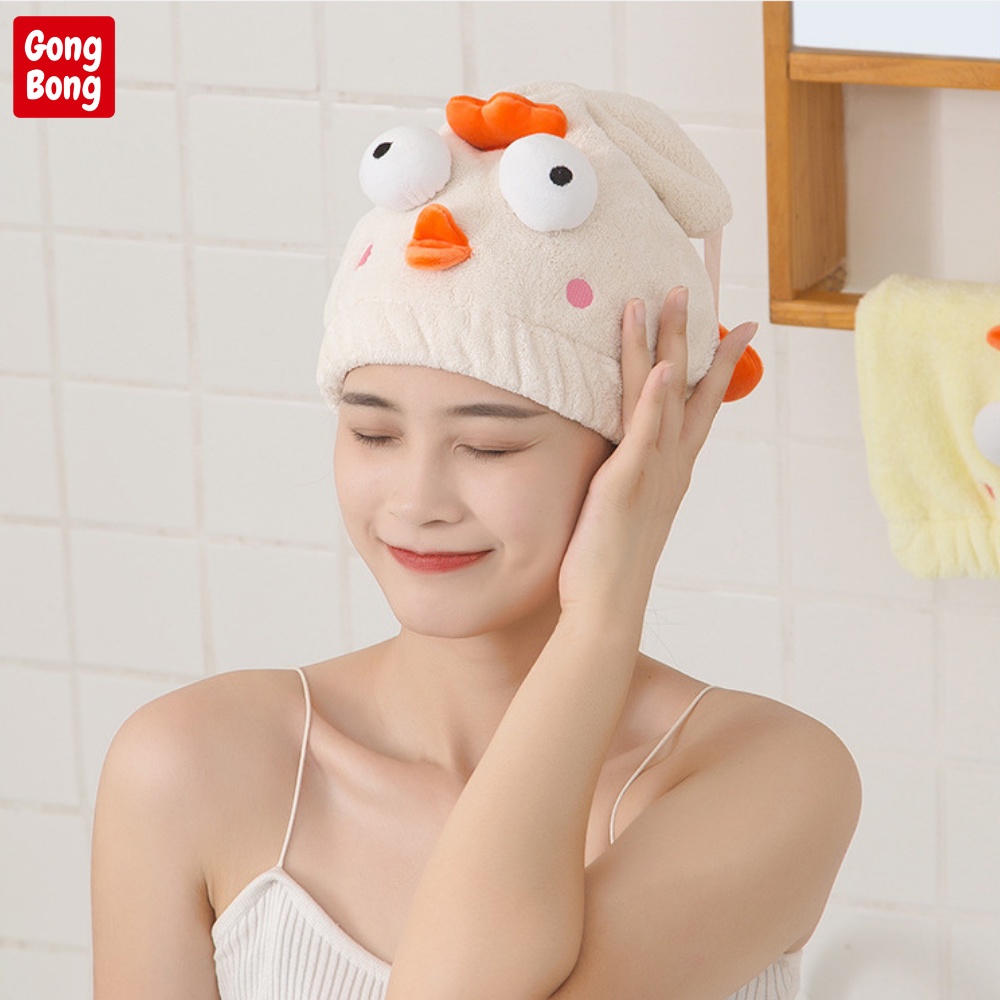Khăn mũ trùm đầu quấn ủ tóc nhanh khô hình gà siêu thấm nước tiện lợi dễ thương