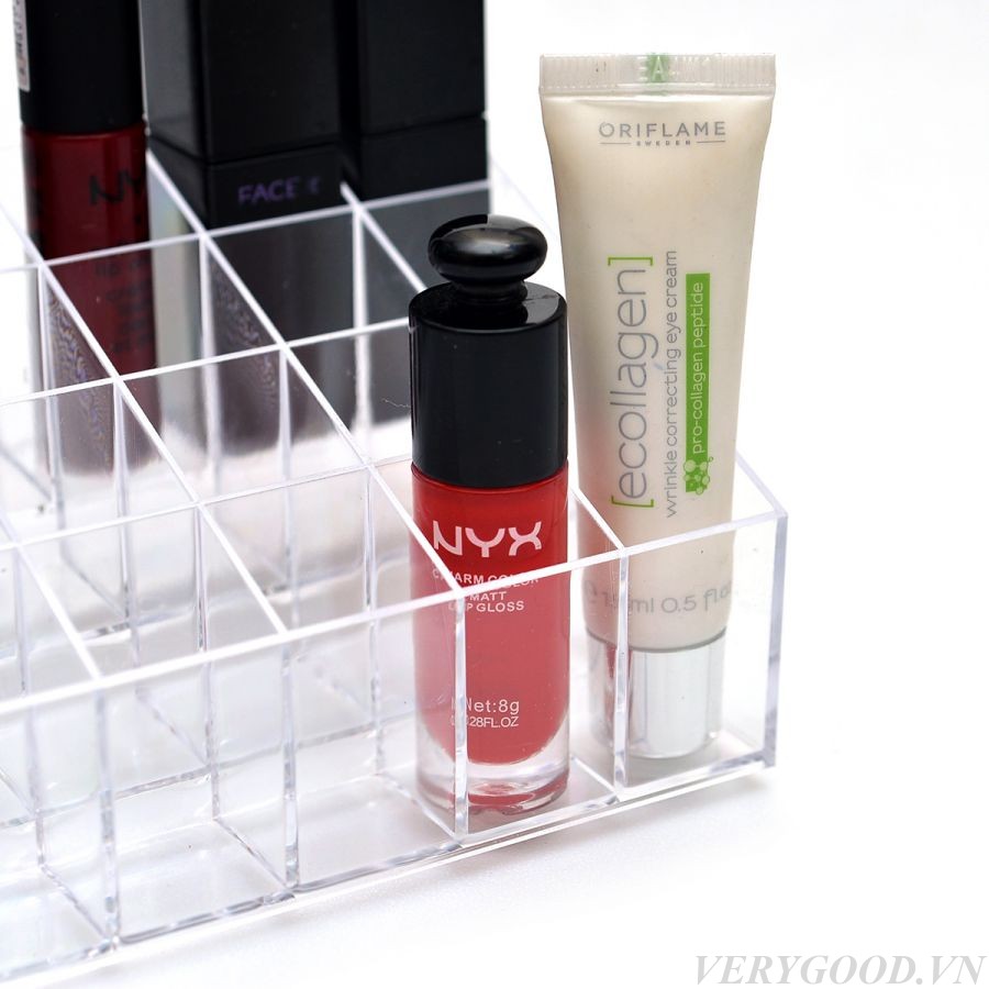 - Thiết kế nhỏ gọn tinh tế: với kích thước mỗi ô chỉ khoảng 3x3cm phù hợp với hầu hết các loại son, kẻ mắt và một số loại kích thước nhỏ khác. Các hàng được xếp bậc thang giúp khi bạn xếp đồ vào vừa dễ nhìn lại rất bắt mắt.