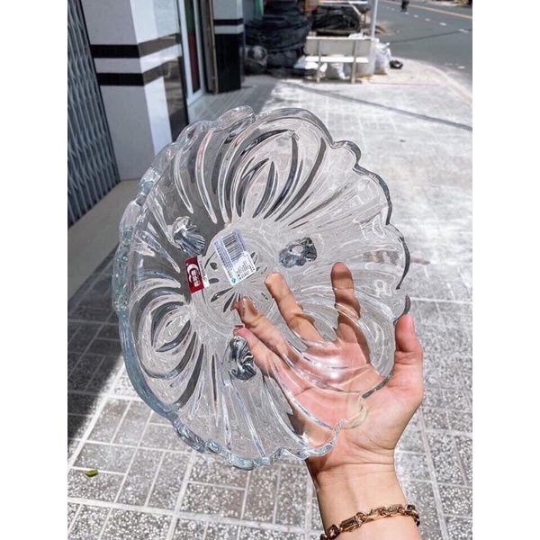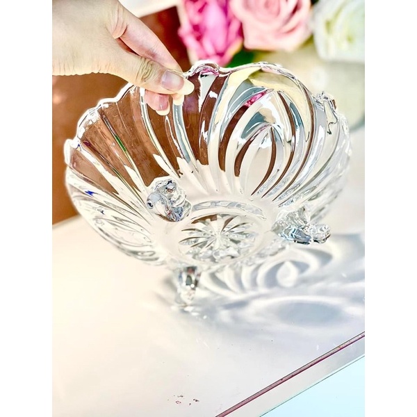 Khay thuỷ tinh 3 chân đựng hoa quả, thả cánh hoa size 23cm