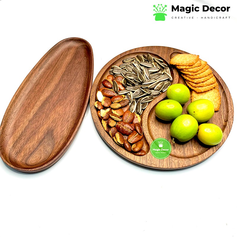 Khay tròn decor 2 ngăn chất liệu gỗ óc chó kích thước D23cm