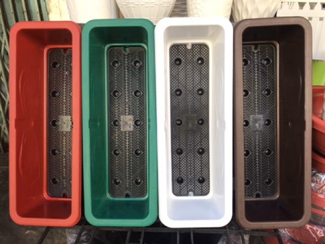 Khay nhựa dài dùng để trồng rau sạch ở nhà.Nhựa tốt, dày dặn, có vành, dễ di chuyển và vệ sinh. Thân chậu có khắc hoa văn Nơ nổi. Đơn giản, đẹp. Bên trong có lót thoát nước, giữ đất không bị trôi
