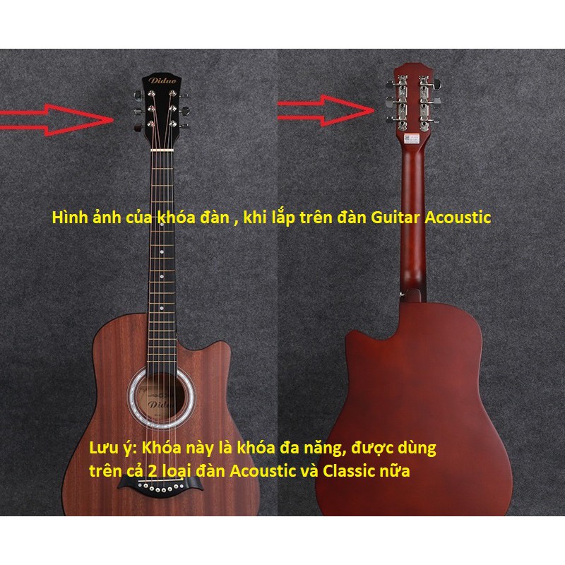 🎸 Loại khóa này là khóa đa năng, được các xưởng đàn lắp trên cả đàn Guitar Acoustic và cả Classic, thường thấy trên đàn Guitar tầm giá rẻ , dưới 1.5 triệu đồng.🎸 Khóa được đi kèm đầy đủ ốc và nắp chụp.