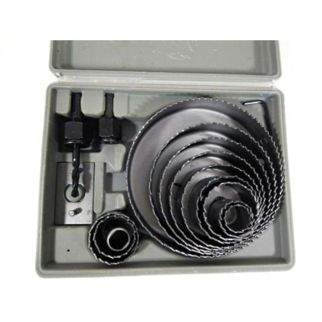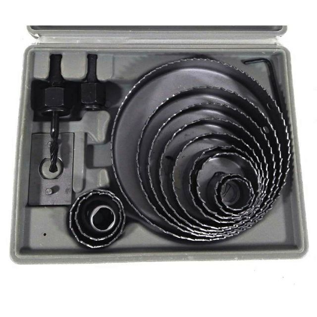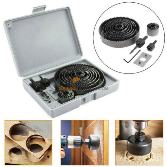 Bộ mũi khoét thạch cao và gỗ mềm 16 chi tiếtBộ mũi khoét chuyên dùng với thạch cao và gỗ mềm như thông, keo và ván công nghiệp Kích cỡ 13 mũi đã dạng: Ø19, Ø22, Ø25, Ø28, Ø32, Ø38, Ø44, Ø54, Ø64, Ø76, Ø89, Ø102, Ø127 (mm) Chất liệu: Hợp kim siêu cứng sơn tĩnh điện chống rỉ