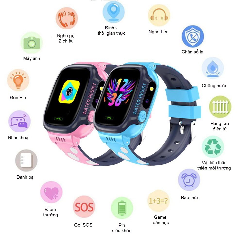Đồng hồ thông minh Y92 chống nước IP67, bản tiếng Việt, lắp sim vào nghe gọi như điện thoại, định vị LBS/Wifi xem con đang ở đâu, có camera chụp ảnh trực tiếp trên đồng hồ và hoặc chụp ảnh từ xa, báo thức, cài chế độ giờ học và nhiều chức năng khác.* Đồng hồ nghe gọi bằng loa ngoài to rõ, dây silicon