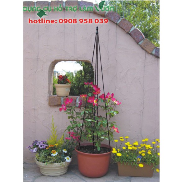 Khung chóp 4 chân Nhật Bản- Khung có thiếu kế đơn giản dễ sử dụng trong chậu hoặc ngoài đất đều được, bộ khung là ống thép bọc nhựa phi 8 màu đen tinh tế, phù hợp với các loại cây hồng leo, hoa leo, dưa leo, đậu biếc, mồng tơi