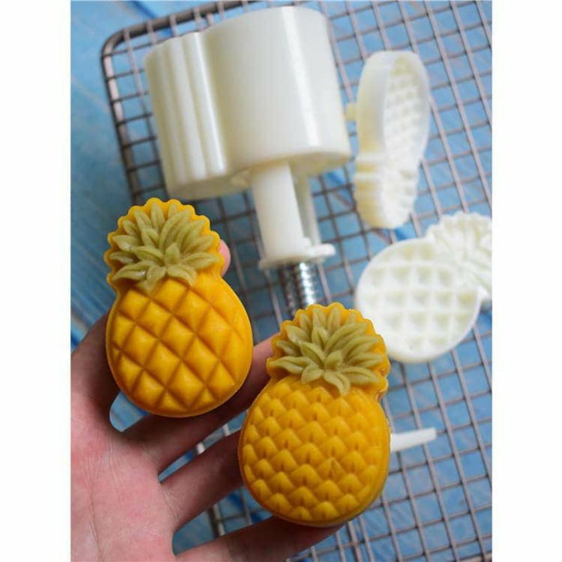 Khuôn quả dứa gồm 2 mặt hình quả dứa và 1 cây nhấn bánh.chất liệu nhựa cứng