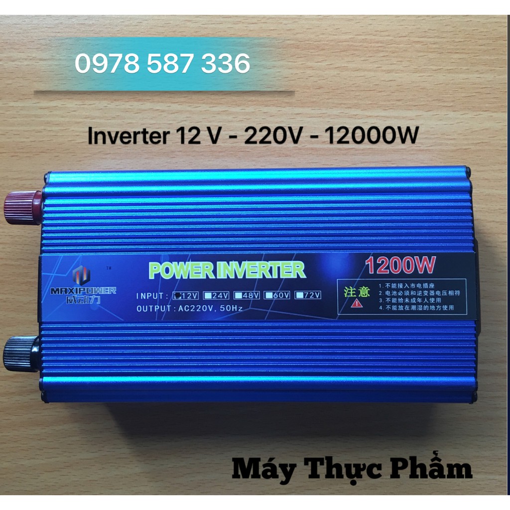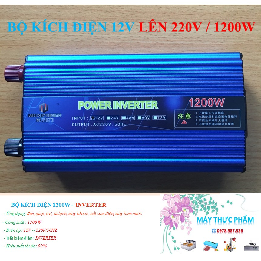 - Máy Thực Phẩm xin giới thiệu sản phẩm Bộ kích điện 12V - 220V - 1200W MAXIPOWER chức năng dùng đổi nguồn từ bình ắc quy 12V sang 220V sử dụng cho các thiết bị điện trong gia đình.