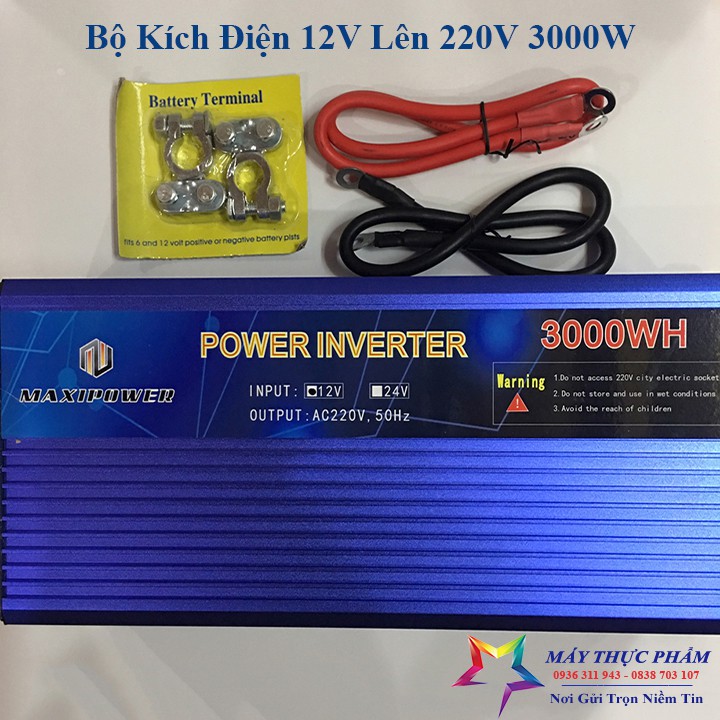 - Máy Thực Phẩm xin giới thiệu sản phẩm Bộ kích điện 12V - 220V - 3000W MAXIPOWER chức năng dùng đổi nguồn từ bình ắc quy 12V sang 220V sử dụng cho các thiết bị điện trong gia đình.