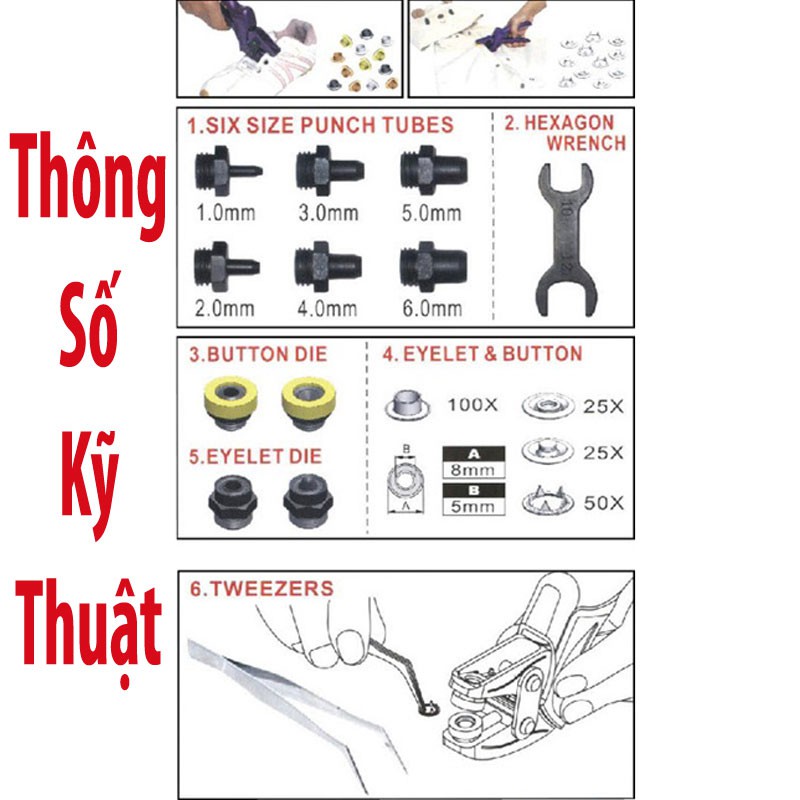 - Bấm được kích thước lỗ: 1mm, 2mm, 3mm, 4mm, 5mm, 6mm