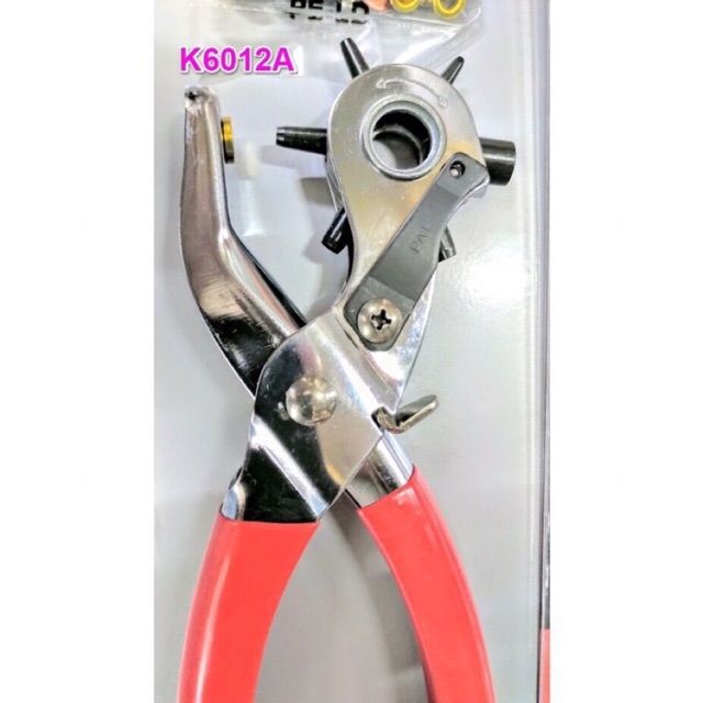 Kìm bấm lỗ dây nịt thắt lưng Top K6012A kèm 100 khoen dùng để đục lỗ , đột lỗ , bấm lỗ trên dây nịt , dây thắt lưng , dây da đeo đồng hồ hay trên các bìa giấy .Kìm bấm lỗ dây nịt thắt lưng Top K6012A kèm 100 khoen có thể đặt được 6 kích cỡ là 1.5mm , 2.5mm , 3.3mm , 4.1mm , 4.5mm , và bấm lỗ giày da đi kèm 100 khoen ,được thiết kế theo kiểu bấm cộng lực giúp cho việc bấm đột đục lỗ trở lên dễ dàng hơn bao giờ hết .