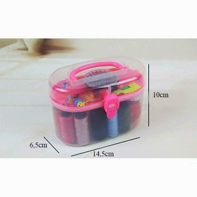 - Bao gồm: cuộn chỉ các màu, kim các loại, kéo cắt chỉ, thước dây, dụng cụ xỏ chỉ, kim băng, cúc bấm, , nhẫn ấn kim, hộp nhựa,