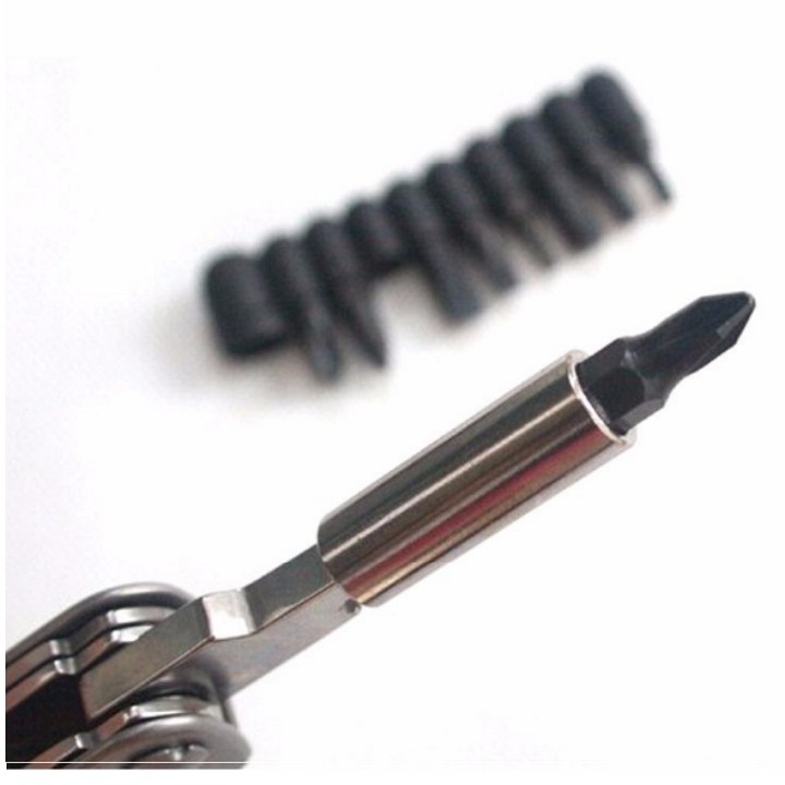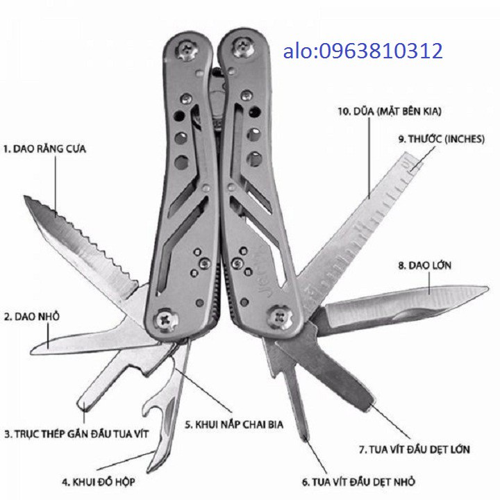 Các chức năng chính: Kiềm,dao ,dũa ,Thước ,đầu vặn vít lớn ,đầu vặn vít nhỏ ,Khui chai ,Khui lon ,đầu vít 4 cạnh ,đầu chuyển đổi các loại vít & bộ 9 đầu vít thay đổi các kiểu